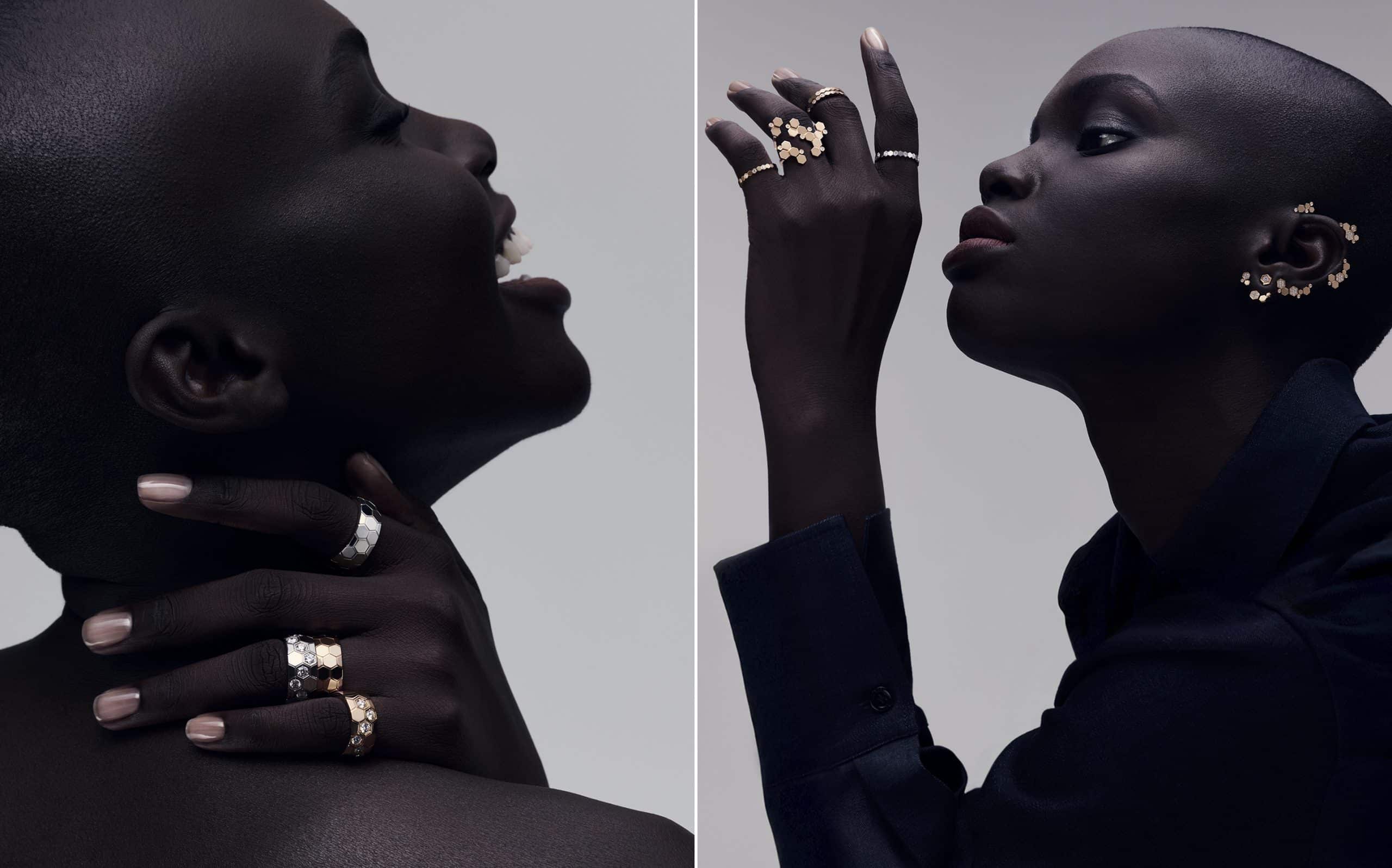 Trung tâm của BST là motif tổ ong lục giác, biểu tượng cho sự gắn kết và tính vô tận. Các nhà thiết kế của Chaumet đã khéo léo khai thác chi tiết này qua những chiếc nhẫn mới với cách sắp đặt linh hoạt của các “tảng ong” bằng vàng đánh bóng mặt gương, điểm xuyết bằng kim cương để tạo hiệu ứng ánh sáng lấp lánh như những giọt mật.
