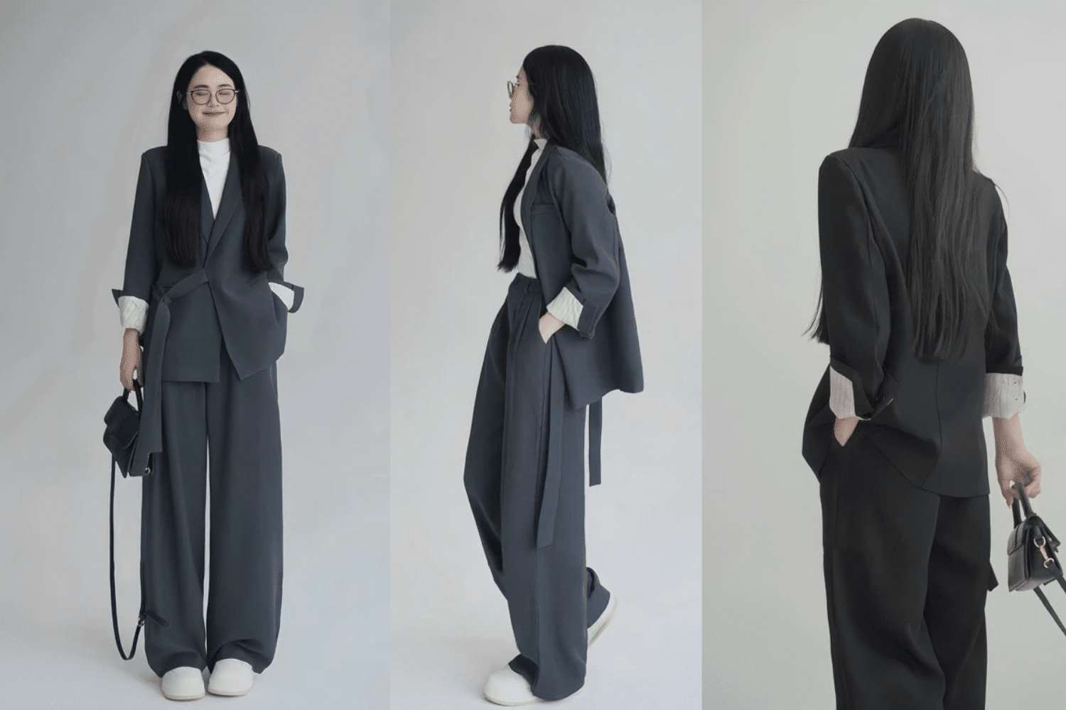Quần âu cạp cao, đường ly thẳng kết hợp với blazer dáng suông tạo hiệu ứng kéo dài vóc dáng. Người mặc trông thanh thoát, chỉnh chu mà không cần phải cố gắng “siết dáng” quá mức.